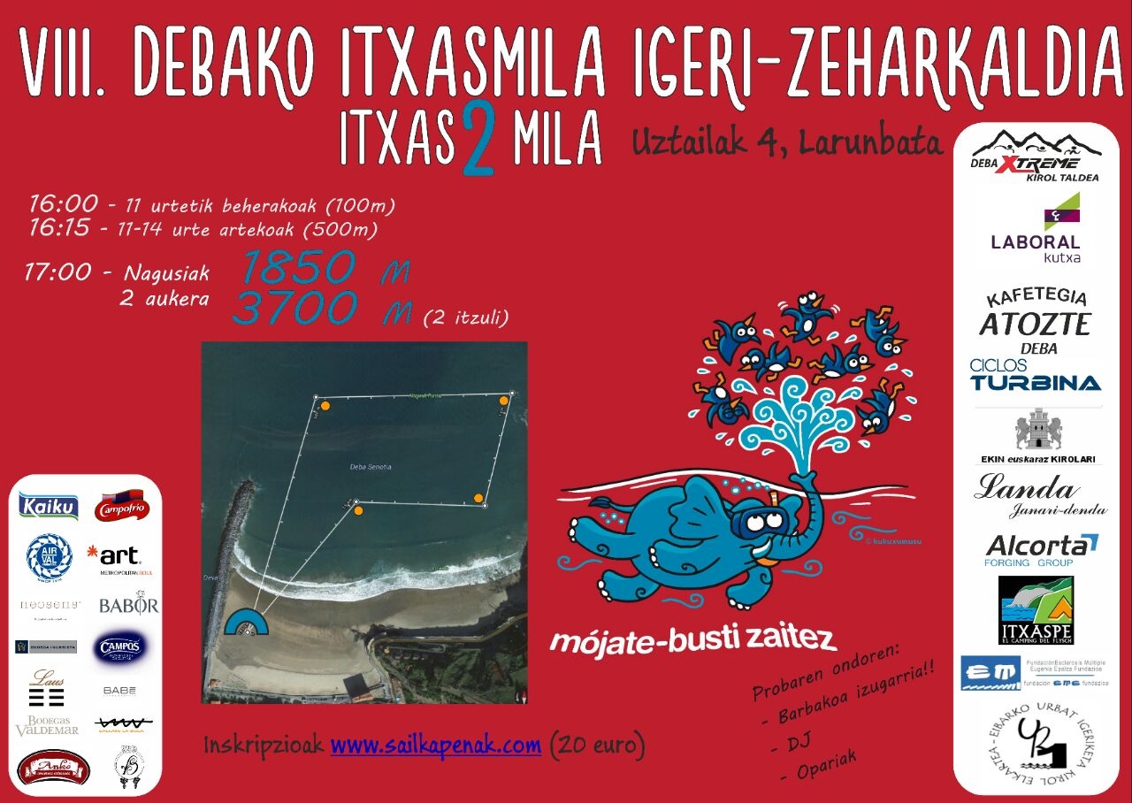 Bigarren hitzordua, Debako hondartzan izango da zapatuan, eta bertan ospatuko da VIII. Debako Itxasmila igerialdia. Antolatzaileek lau probetan banatu dute txapelketa: 16:00etan 11 urtetik beherakoentzat 100 metroko proba; 16:15etan, 11-14 urte artekoak eta 500 metrotako igeriladia eta 17:00etan, helduak 1.850 metrotako distantzia egingo dute edo bigarren aukera 3.700 metrotako ibilbidea (bi itzuli).