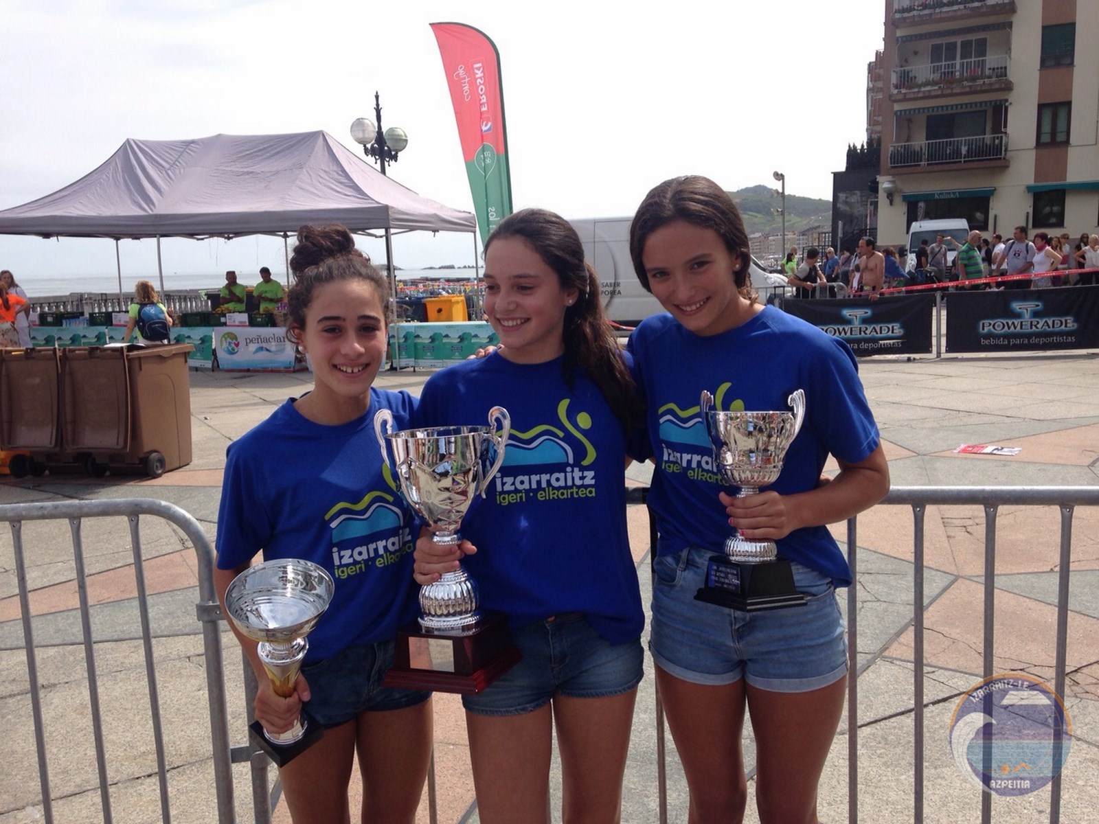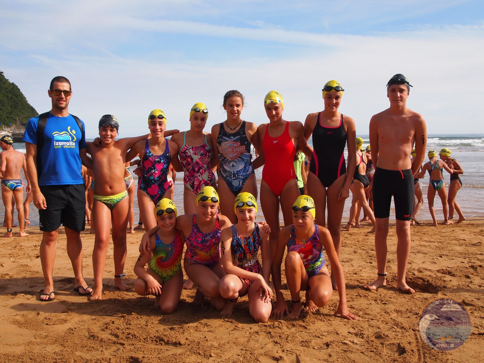 Aurrenik, 10:30etan, infantil mailako 115 igerilari irten ziren Zarautzeko hondartzatik, 800 metroko luzera zuen igerialdia egiteko. Gure taldeko 12 igerilarik, (9 neska eta 3 mutil) hartu zuten parte. Denak txukun ibili ziren, batzuentzat lehen esperientzia zen itsasoan baina hala ere ondo moldatu ziren olatu arteko lehiaketan. Neskatan, Paula Urrestilla izan zen bigarrena helmugara iristen.