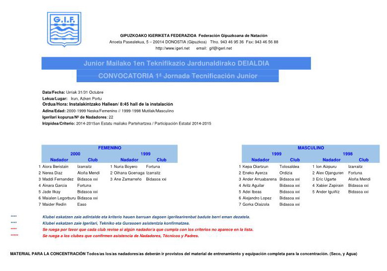 Urriaren 31ean, zapatua, Gipuzkoako Igeriketa Federazioak Junior mailako igeriketako 1. teknifikazio saioa antolatu du.
