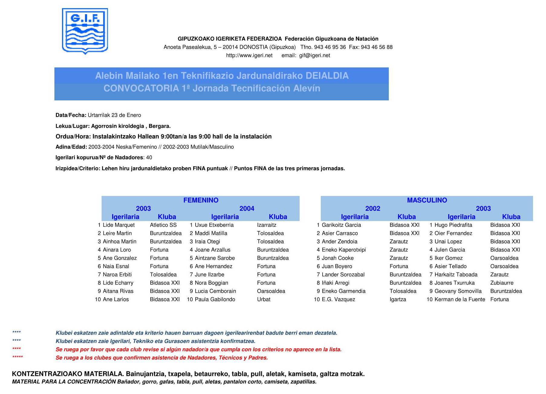 Urtarrilaren 23an, zapatua, Gipuzkoako Igeriketa Federazioak Alebin mailako igeriketako 1. teknifikazio saioa antolatu du.