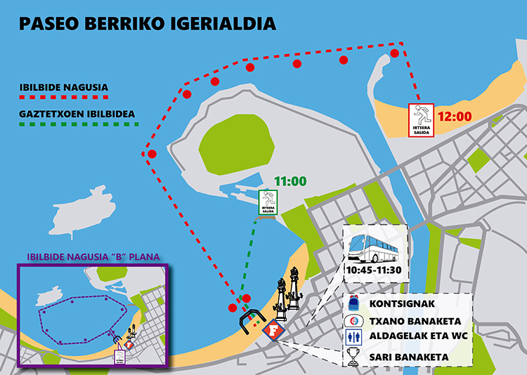 Nautikotik, goizeko 11etan, irtengo dira infantilak Kontxako hondartzaraino, 650 metrotako igerialdia egiteko. Gero, 12etan, irteera emango zaio, Zurriolako hondartzatik, helduen igerialdiari. Hauek, 2.959 metro egin beharko dute Kontxako hondartzaraino.