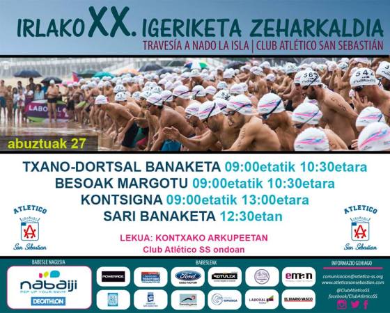 Kontxako Atletiko San Sebastian Elkarteko egoitzaren paretik, goizeko 10:30etan irtengo dira infantilak. 600 metrotako igerialdia egin beharko dute infantil neska-mutilak. Gero, 11:00etan, eta toki beretik, irteera emango zaio helduen igerialdiari. Hauek, 3.000 metro egin beharko dute Santa Klarako irla zeharkatuz.