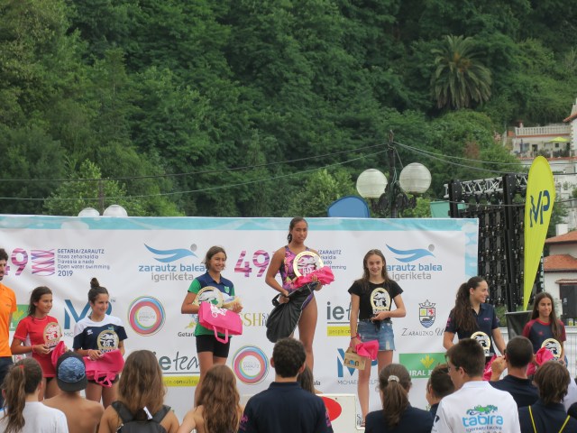 Igandean, aurrenik, infantil mailako neska mutilak irten ziren Zarautzeko hondartzatik 800 metroko luzera zuen igerialdia egiteko. Gure taldeko onena Elene Sudupe izan zen 4. postua lortuz.