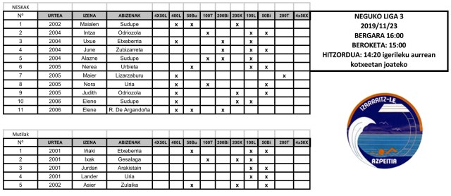 Izarraitz Igeri Elkarteko igerilari helduek Neguko Liga Probintzialeko hirugarren jardunaldia izango dute zapatu honetan, Bergarako Agorrosin igerilekuan. Jardunaldia arratsaldeko 16:00tan hasiko da.