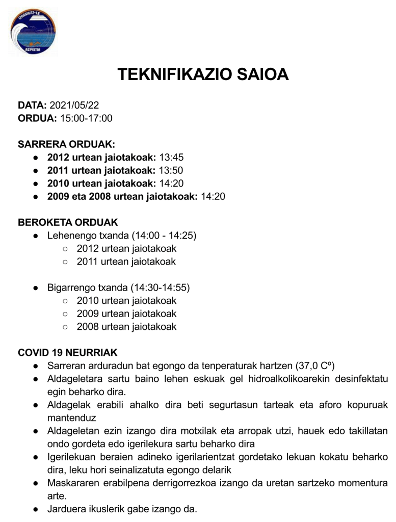 Gure taldeko txikienak, (2008.urtean jaiotakotik 2012. urterartekoak) teknifikazio saioa izango dute zapatuan, maiatzaren 22an, arrataldeko 15:00 Azpeitiko Udal igerilekuan. Bertan ikusiko dugu denboraldian zehar landutako ikasketak. Zoritxarrez gurasoak ezin izango dute ikusi gaztetxoen ariketak. Ea datorren denboraldian normaltasunez hasten dugun igeriketako saioak.