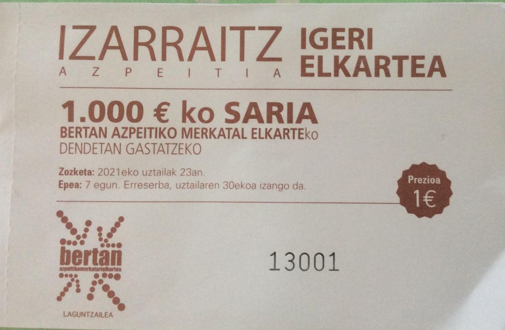 Saria, iaz bezala, Bertan Azpeitiko Merkatari Elkartearen laguntzarekin, 1000€ ko bonoa izango da, Bertan Azpeitiko Markatal Elkarteko dendetan gastatzeko.